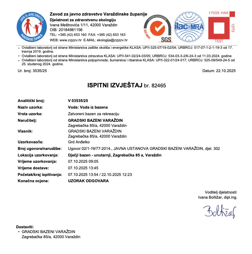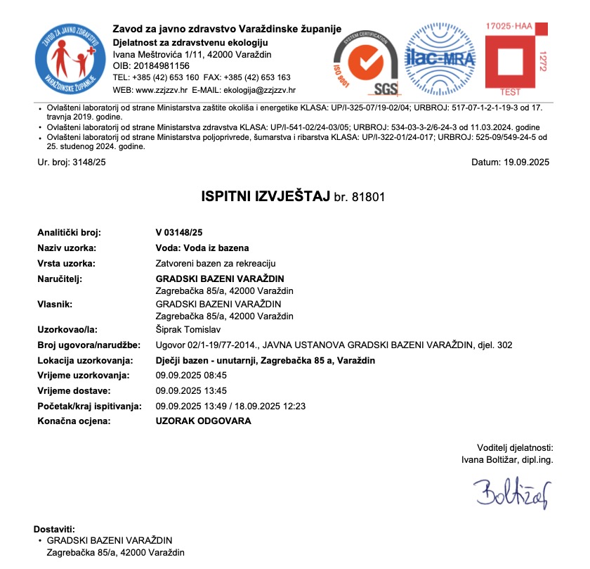 Zavod za javno zdravstvo Varaždinske županije, Djelatnost za zdravstvenu ekologiju dostavilo nam je ispitne izvještaje o kvaliteti bazenske vode.Ukoliko želite