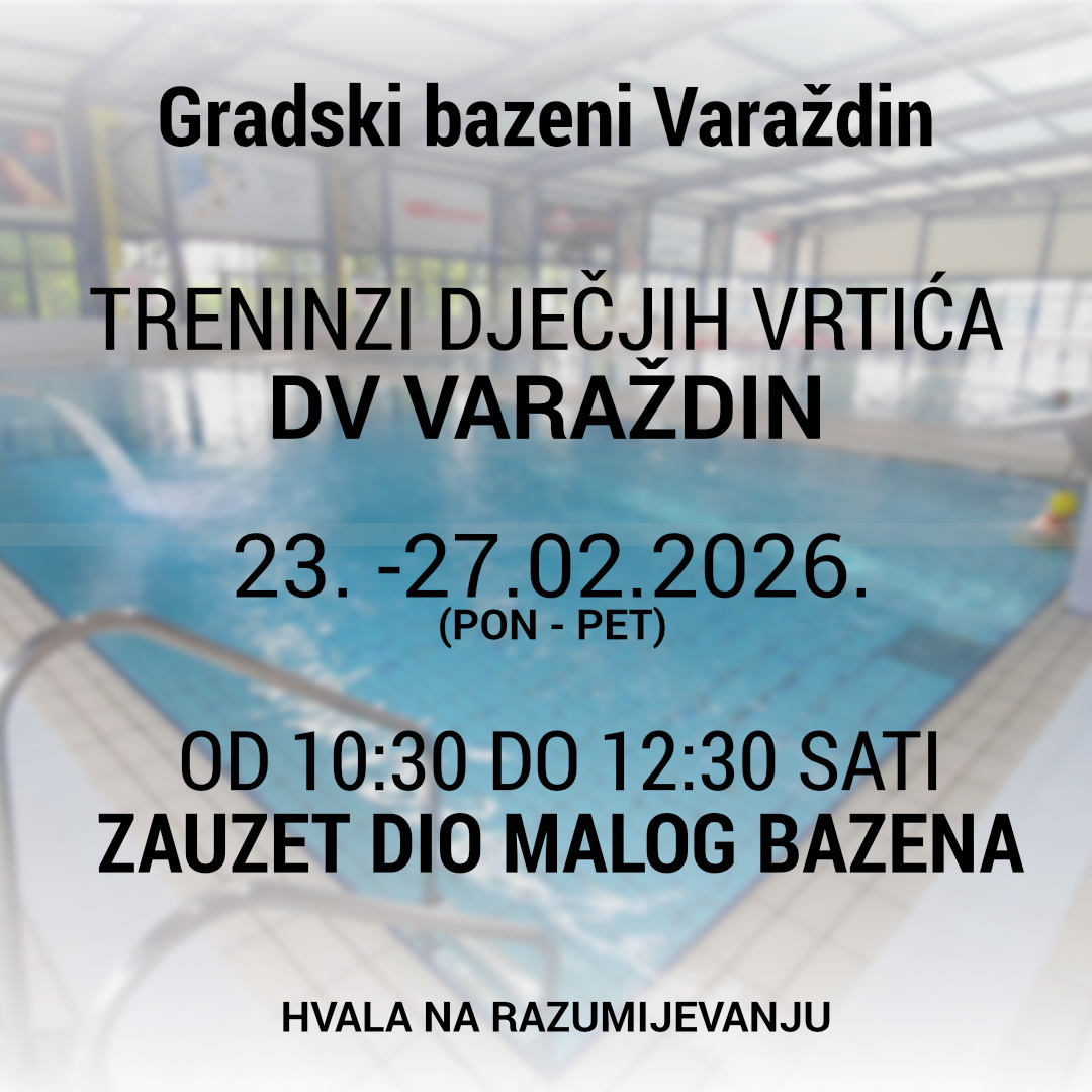 Poštovani korisnici, obavještavamo vas da će se na našim bazenima održati treninzi dječjeg vrtića Varaždin u terminu: od ponedjeljka do
