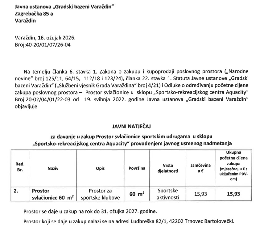 Varaždin, 16. ožujak 2026. Broj:40-20/01/07/26-04 Na temelju članka 6. stavka 1. Zakona o zakupu i kupoprodaji poslovnog prostora („Narodne novine“