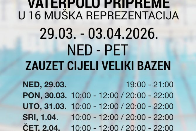 Pripreme U16 vaterpolo reprezentacije od nedjelje 29.03. do petka 03.04.2026.