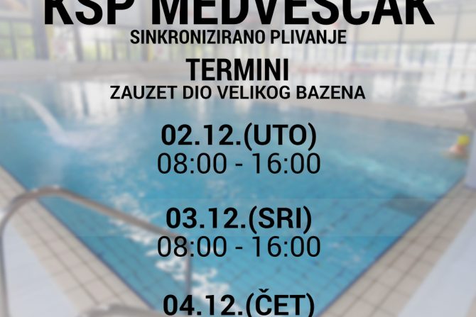Zbog održavanja treninga, u navedenim terminima bit će zauzeta polovica (1/2) velikog sportskog bazena: